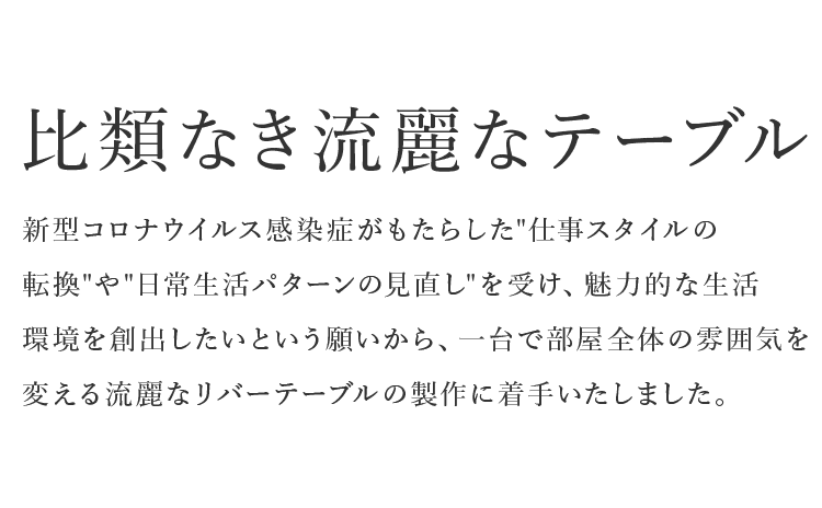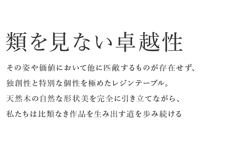 唯一無二の天然木の美しさを引き立て、高度な技術と丁寧な 仕上げによって製作されたレジンテーブルは、お客様の空間に 上質な雰囲気をもたらします。 天然木本来の形状と温もりを最大限に活かすため、レジンは 極めて高い技術を要する水のような透明度を実現しています。 洗練されたデザインと美しさが調和したこのテーブルは、空間 全体を魅力的に演出し、特別な時間を創り出し続けます。